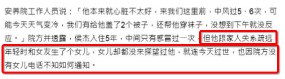 根据最新的报道,侯杰离世后女儿似乎也没有要来探望的意思,这样的遭遇不免让人心凉。