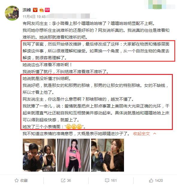 而最终李小璐却选择了样貌与资产都不如贾乃亮的pgone,也是让不少网友心存疑问,11月4日,有知名作家洪峰点评了此事。