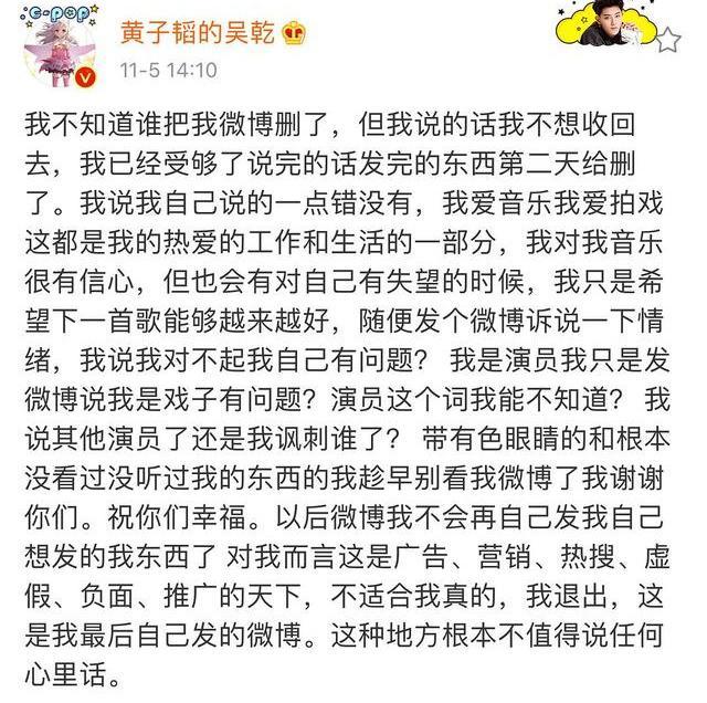 原标题:黄子韬称演员是戏子惹争议,怒而宣布退出微博:这种地方不