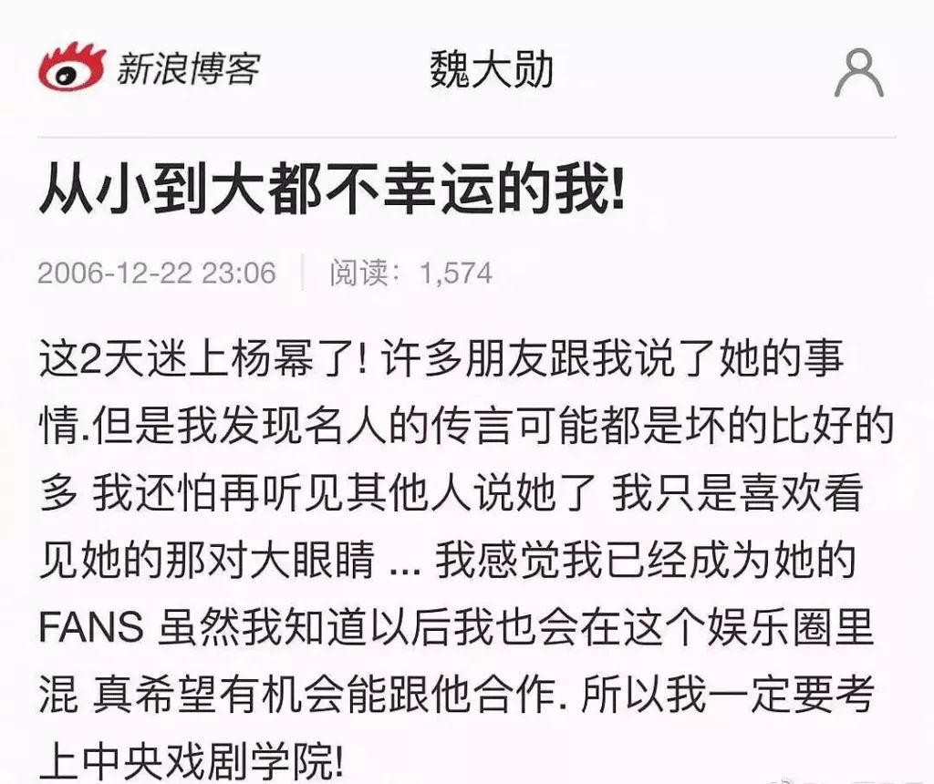 两人的缘分能追溯到十几年前了。2006年,杨幂饰演郭襄那版本的《神雕侠侣》播出。那时魏大勋才17岁,在博客上表示“迷上了杨幂”,并励志地写道“真希望有机会能跟她合作,所以我一定要考上中央戏剧学院”。可见,魏大勋很早之前把杨幂视为偶像。