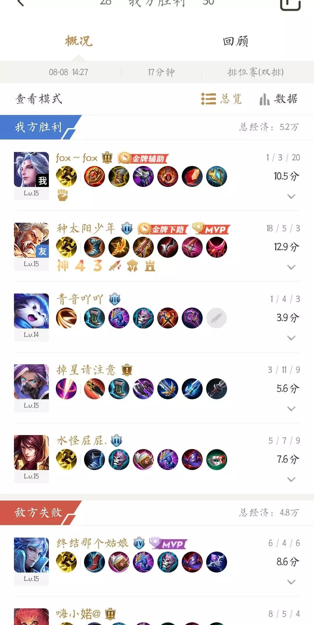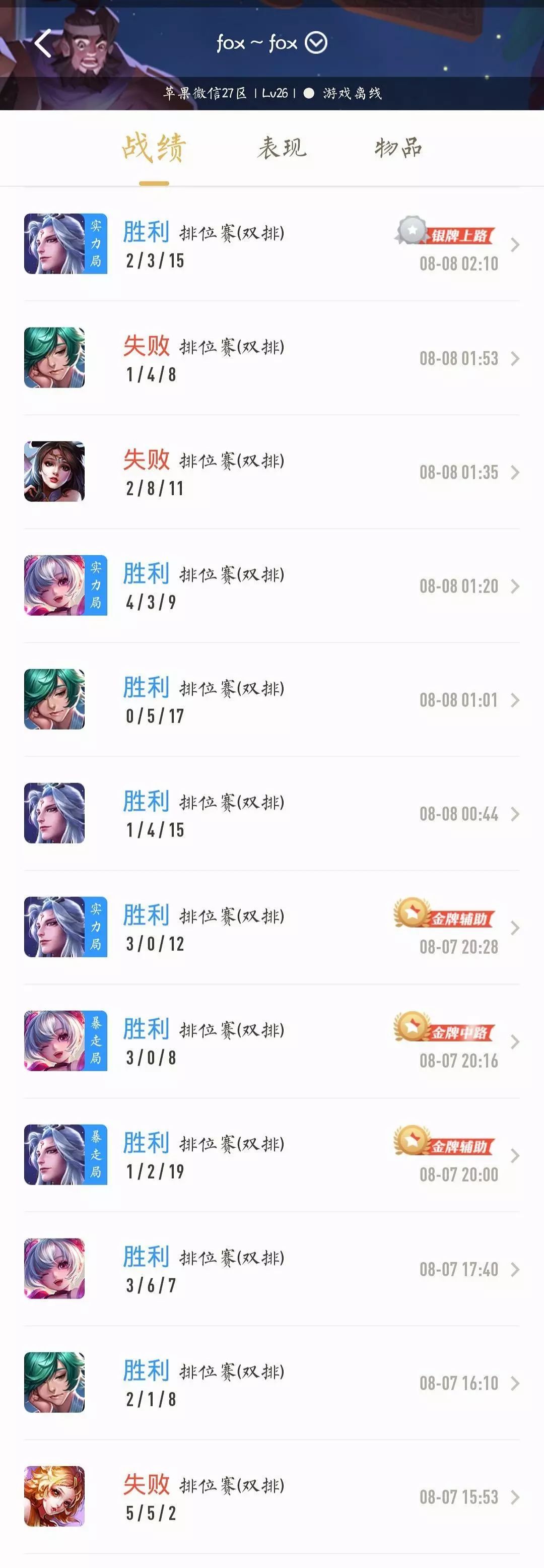 战绩上显示她从八月七号下午三点和一个人一直双排到八号凌晨两点。