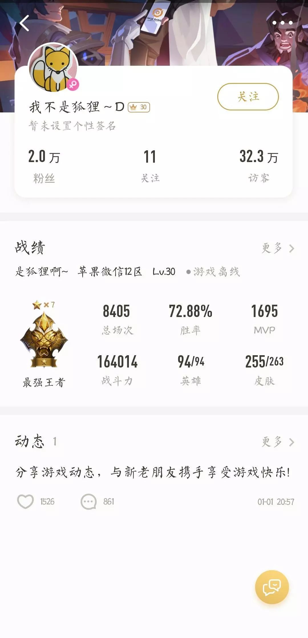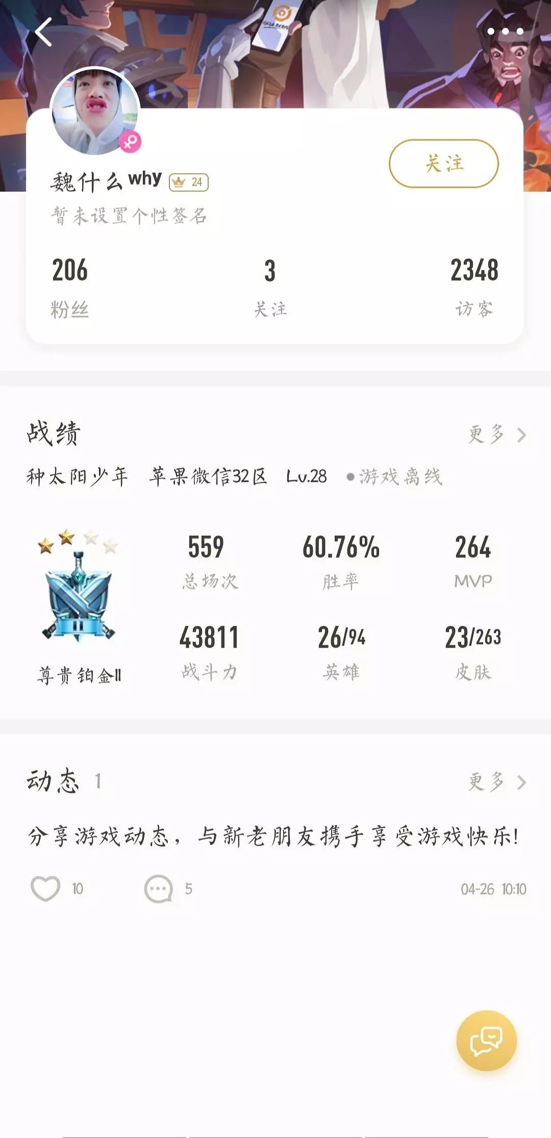 点进该人主页,头像是魏大勋的自拍图。据说,王者主页号是魏大勋本人的微信号,头像也是当时的微信头像。但究竟是否是他本人的王者号,未有进一步实证。