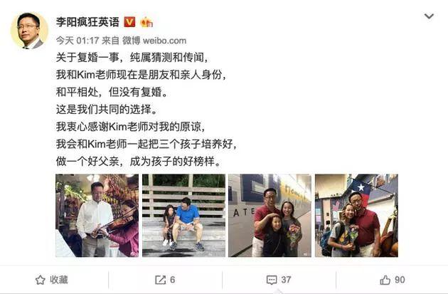 12月7日凌晨,疯狂英语创始人李阳微博晒和女儿的合影,并回应复婚称纯属猜测“我和Kim老师现在是朋友和亲人身份,这是我们共同的选择。”并感谢前妻的原谅,“我会和Kim老师一起把三个孩子培养好,做一个好父亲,成为孩子的好榜样。”