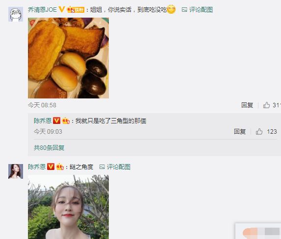 有网友在动态下面留言,一些网友说道,“姐姐,你说实话,到底吃没吃”,陈乔恩竟然回答说:我就只是吃了三角形的那个,场面十分逗趣。心情大好的陈乔恩,还晒出自拍图,并称迷之角度,真是很嗨皮了。不知道是不是因为化了个美妆而高兴呢?
