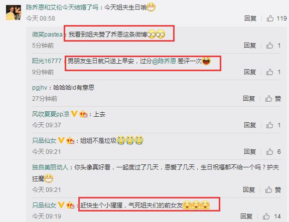 仔细发现,还有网友评论,“今天姐夫生日哦”、“我看到姐夫赞了乔恩这条微博”、“男朋友生日就只送上早安,过分”、“赶快生个小猩猩,气死姐夫们的前女友”,网友们纷纷评论,直言让陈乔恩和艾伦赶快生小孩,并说今天是男友生日,作为女友的陈乔恩,会有什么表示呢?希望他俩感情好好的。