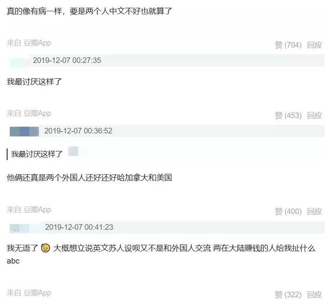 当然,吴亦凡是加拿大籍华人,潘玮柏是美籍华人,再加上常年在国外发展音乐,用英文交流可能只是无意识的习惯。但隔壁节目里郎朗的妻子吉娜一个货真价实的外国混血儿还努力说中文呢,甚至被郎朗在线教普通话,两相对比,差距有点大,也难免引发争议。