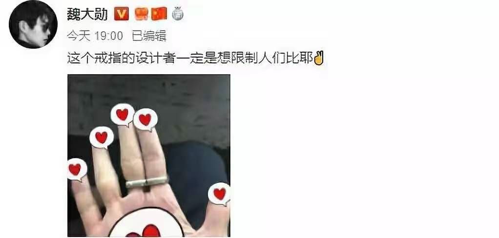 10月7日,魏大勋发了一条微博,晒了两枚戒指,文案是戒指限制了人们比耶。