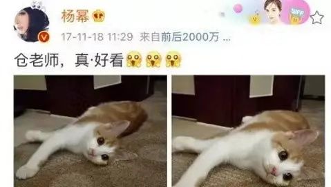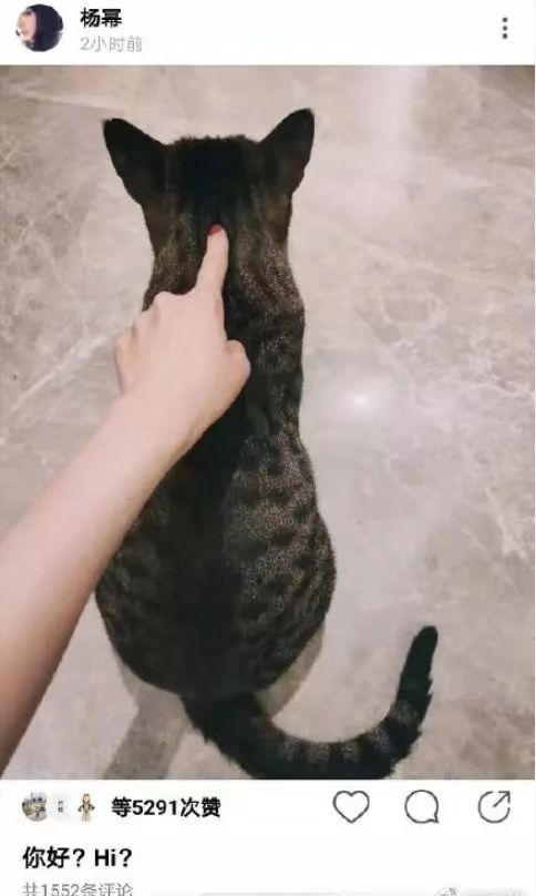 但是时隔两个小时之后,杨幂在“绿洲”上,发了个猫图,配的文案,也是“hi”。