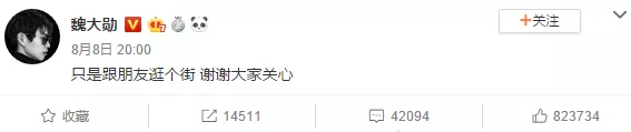 与此同时,魏大勋发的微博也很模棱两可,他说,:只是跟朋友逛个gai,谢谢大家关心。