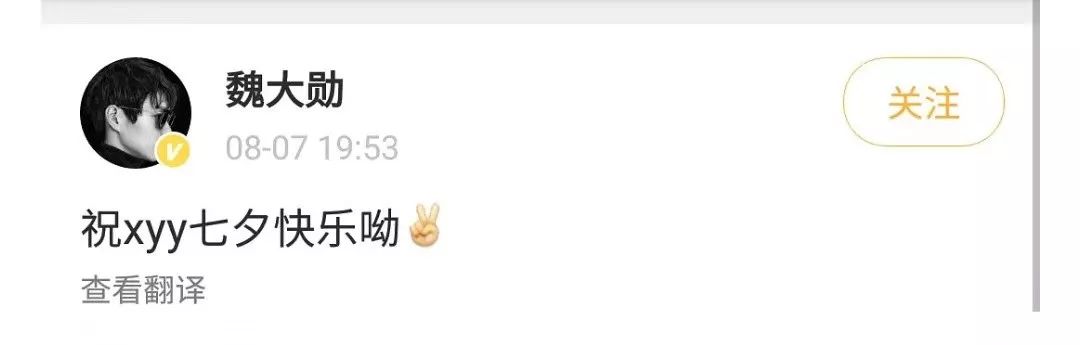 8月7日七夕节当天,魏大勋发了一条微博,说“祝xyy七夕节快乐哟”