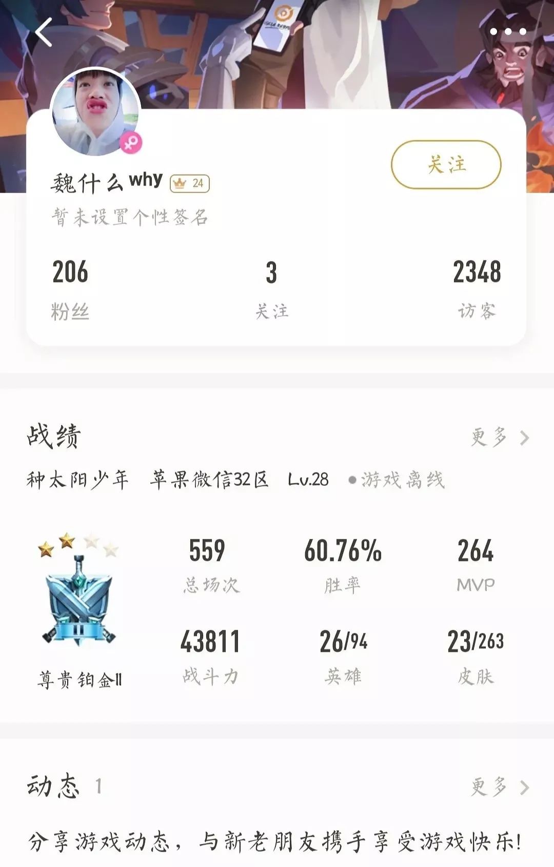 然后,和她打双排的人,游戏名叫“种太阳少年,”点进他的个人主页,叫“魏什么why”,头像也是魏大勋本人的恶搞自拍。。。