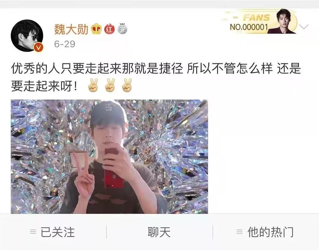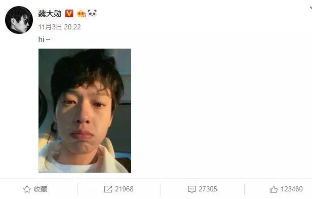 转眼到了11月份,某一天,魏大勋很日常的在微博上发了一个“hi~”,看起来就是跟粉丝的互动而已。