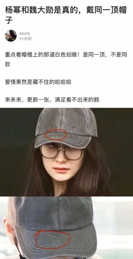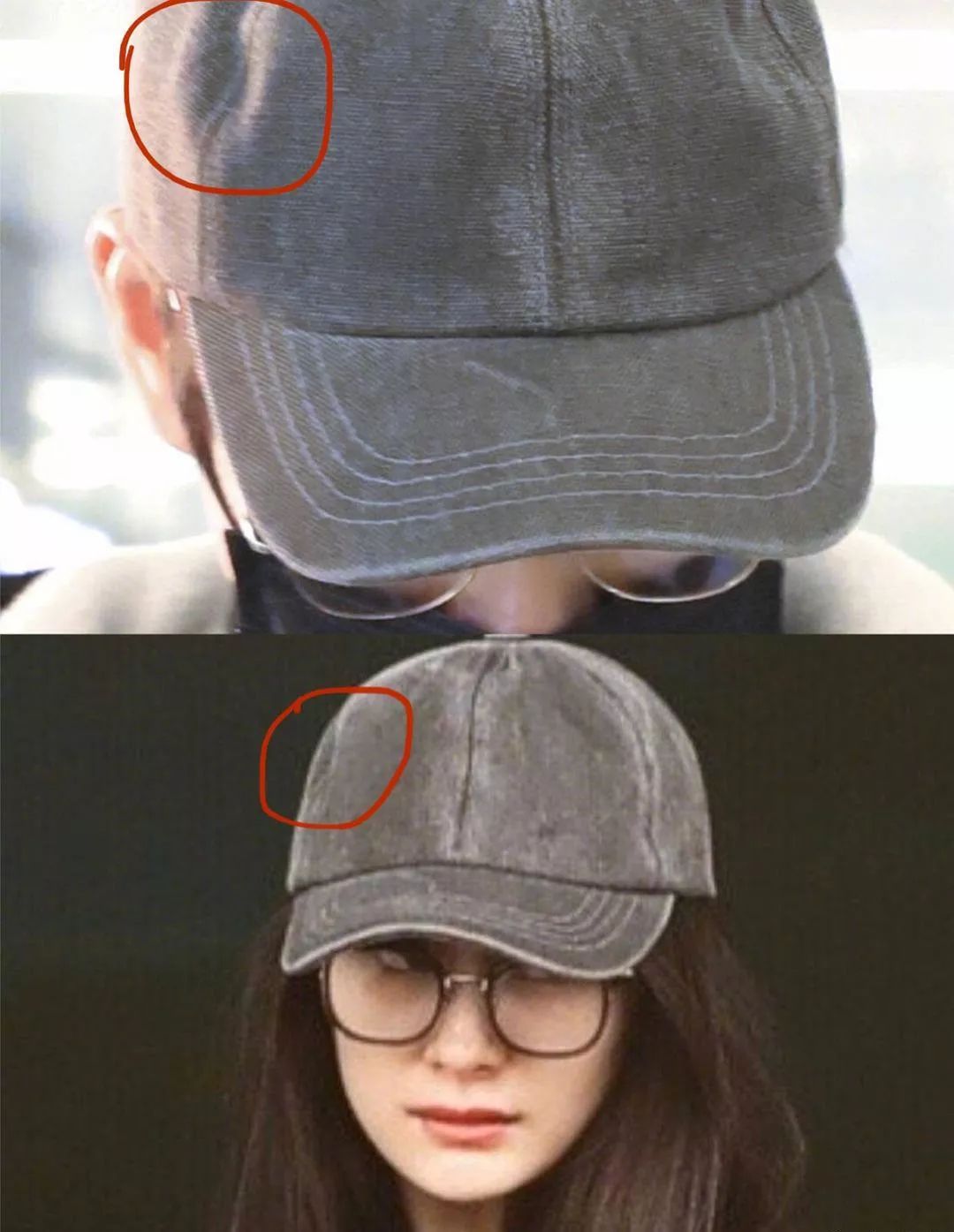 但网友从路透图中发现,杨幂的帽子中间竟然有道杠,应该是划痕之类的人为造成了!