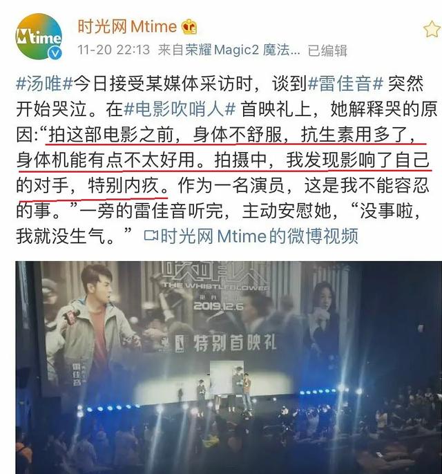 当然,如果雷佳音深入了解汤唯为什么老上厕所,她应该也就舍不得吐槽了。汤唯在当天的《吹哨人》首映礼上才透露自己因为身体不舒服,服用抗生素多了,导致身体机能不太好用。所以虽然拍戏时很不应该上厕所,但人有三急,没法控制。