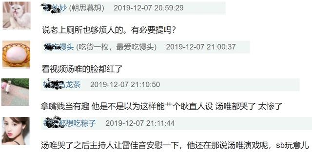 后来汤唯离开镜头,说自己要去哭一分钟,雷佳音反问:“不至于吧?真的呀?”主持人蓝羽再次提醒雷佳音:“你不要去安慰一下吗?”雷佳音很硬气回答:“我安慰啥啊,哭完不就回来了嘛。”
