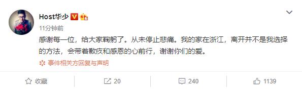 由于传闻愈演愈烈,华少在12月7日也是发声就此事做出了说明,文中华少表示自己从来没有停止过悲痛,同时还表示离开并不是自己的选择,自己会带着内疚与感恩的心前行。