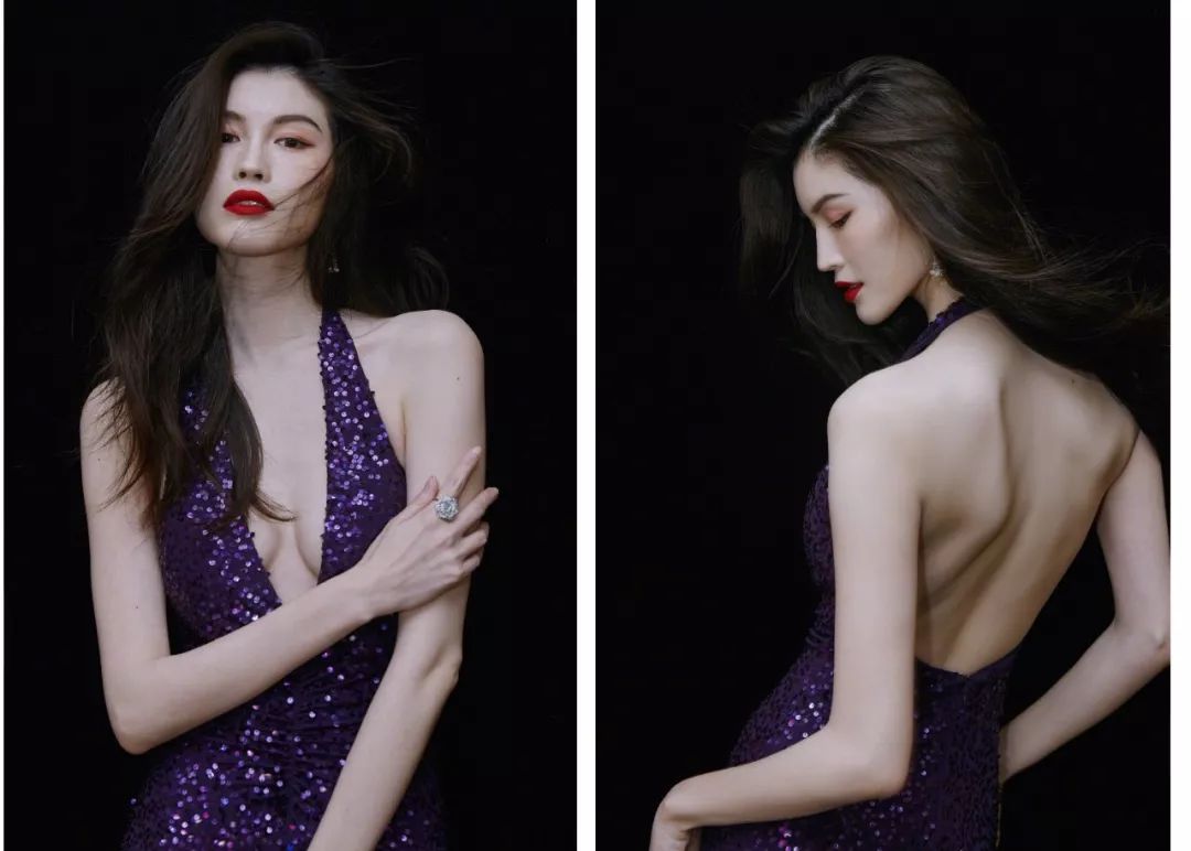 白到发光的皮肤和神秘优雅的紫色连衣裙很和谐,深V露背大秀性感,长腿美背,这身材和气质绝了。