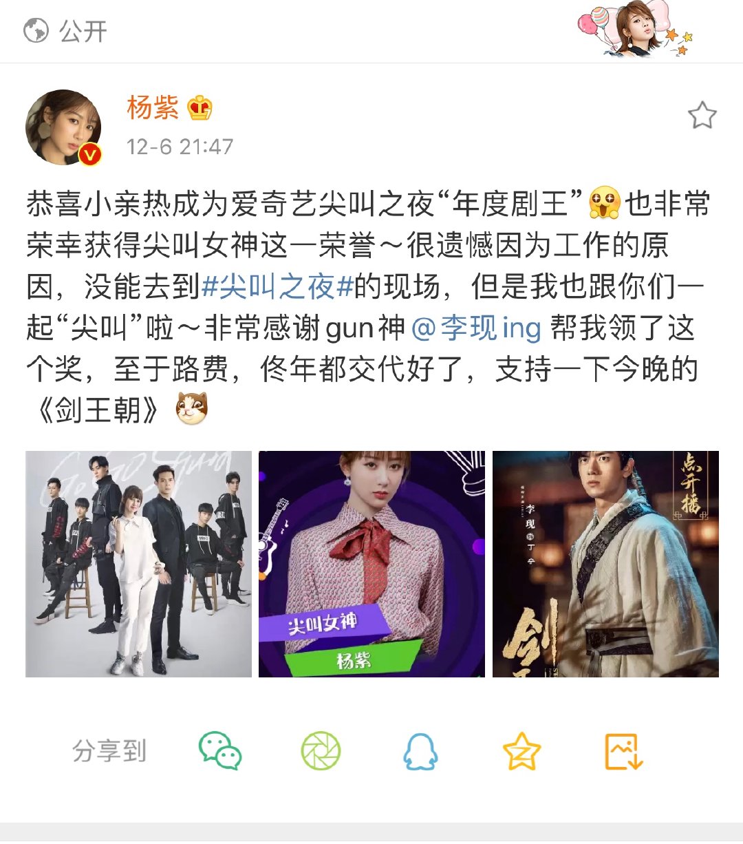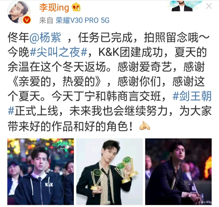 昨晚的爱奇艺尖叫之夜,她虽然没能去成,但获得了“尖叫女神”。李现上台替她领奖,并表示:“一会儿也会和这个奖杯合影,会告诉她我帮她领了这个奖”。李现和杨紫是大学同学,两人的关系也因为《亲爱的热爱的》这部剧变得更好了呢!