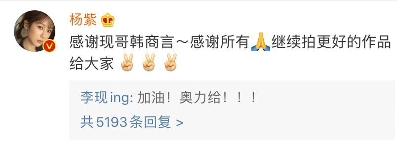 杨紫也在李现的微博下评论,感谢李现,一声称呼撇清关系,喊李现为“现哥”,表示感谢所有,继续拍更好的作品给大家,而李现也回复加油!