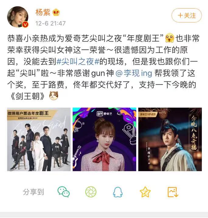 杨紫知道获奖的消息后也发了微博,并且要李现将奖杯带给他,至于路费,就折成自己帮他新剧的宣传费,小猴子也是很精,有点斤斤计较了,人家李现一定很感激两人的合作,帮她领奖也是应该的,两人在《亲爱的,热爱的》撒了很多狗粮,获得很多年轻粉丝的热爱。李现也很坦言和杨紫的合作很愉快,而且经常在片场打打闹闹,杨紫的性格很活跃,和每一位合作的男演员都能够处成哥们,这个也是无敌了。因为相同的话也从邓伦口中说过。不过邓伦和杨紫主演的剧播完之后,两人很少互动,和李现就不同,很自然,没有让大家多想,他们就是好朋友。