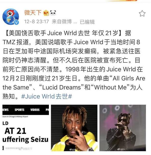 Juice Wrld是四年前开始在歌坛上声名鹊起的,他近年来最受中国歌迷喜爱的音乐作品是《All Girls Are the Same》,不少无法接受他突然离世的歌迷难以抑制自己的悲伤。有高三生表示,难忘Juice Wrld陪他度过的那些个高三复习的不眠之夜,这么好的说唱歌手,就这么走了,难以接受。