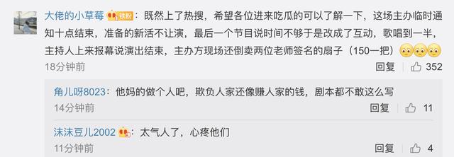 有知情观众曝出事情内情,这场主办方临时通知决定十点结束,准备的新节目不让演,最后一个节目说时间不够于是改成了互动,歌唱到一半,主持人上来报幕说演出结束,主办方现场还倒卖两位老师签名的扇子,150元一把。