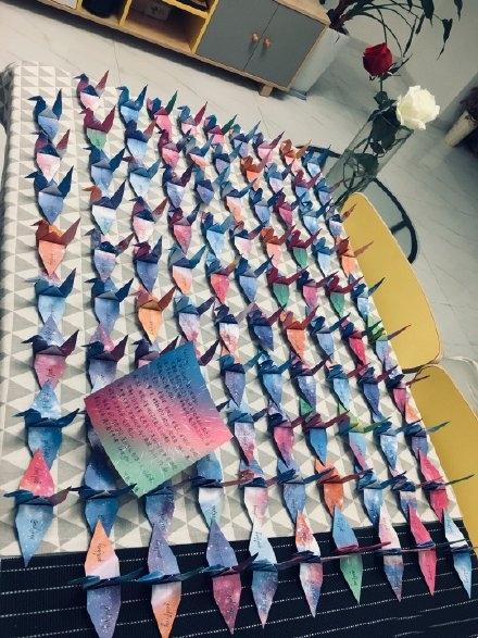 不少粉丝还在高以翔工作室官博的下方评论晒出自己叠的千纸鹤。五颜六色,精心选了纸张用心去叠。粉丝们将对高以翔的不舍和留念和感谢都写在了千纸鹤上。