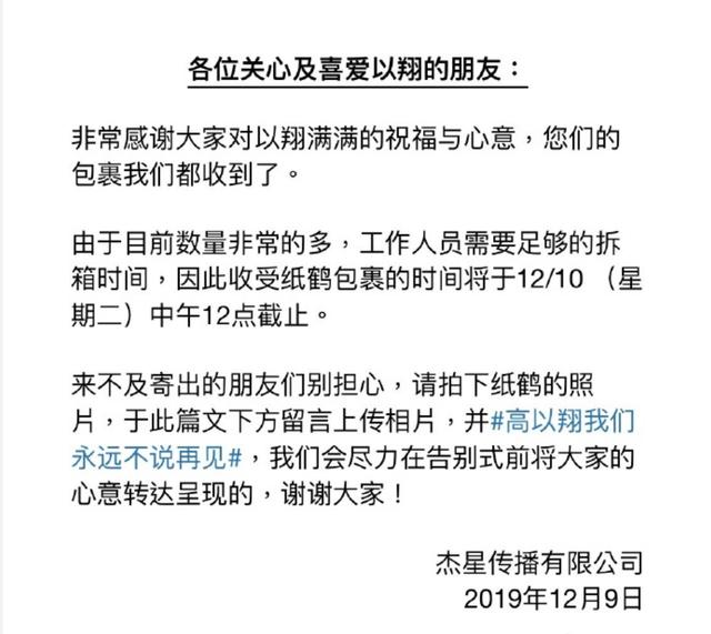 12月9日,高以翔生前的经纪公司表示,已经收到了大家寄送的千纸鹤,但由于数量非常多,工作人员需要足够的拆箱时间,接受包裹的时间将于12月10日中午12点截止。对于来不及寄出的,希望拍下千纸鹤的照片,上传留言,会尽力在告别式之前转发心意。