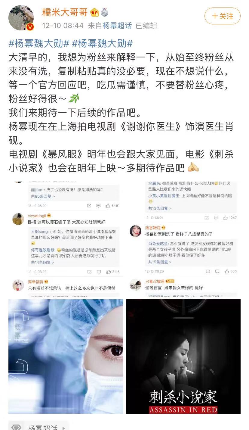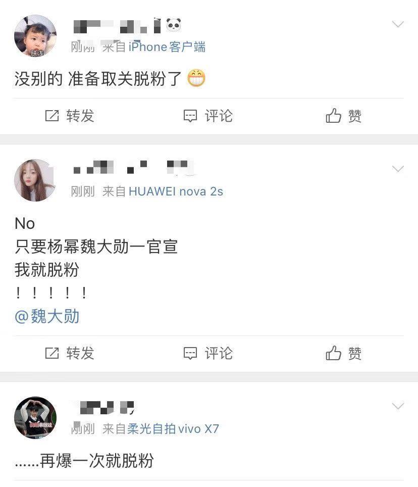 杨幂的粉丝很多还是比较理智,在实锤证据面前,话语也变得很谨慎,坐等回应,并没有洗,看来杨幂粉丝也认为魏大勋配不上杨幂,看来两家粉丝要撕逼,之前刘恺威和杨幂的粉丝都是互撕,现在离婚了,也没什么好撕的了,粉丝是不能左右明星恋情的。