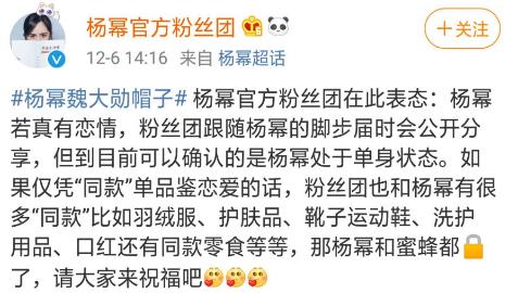 关于杨幂魏大勋的恋情绯闻已经沸沸扬扬传了几个月了,即使网友扒出两人多次合体参加节目,还有逛街以及鞋子和帽子等多种同款,但魏大勋之前矢口否认只是朋友逛街吃饭,而杨幂这边毫无动静绝不回应,不否认更不承认,真相一直云里雾里。