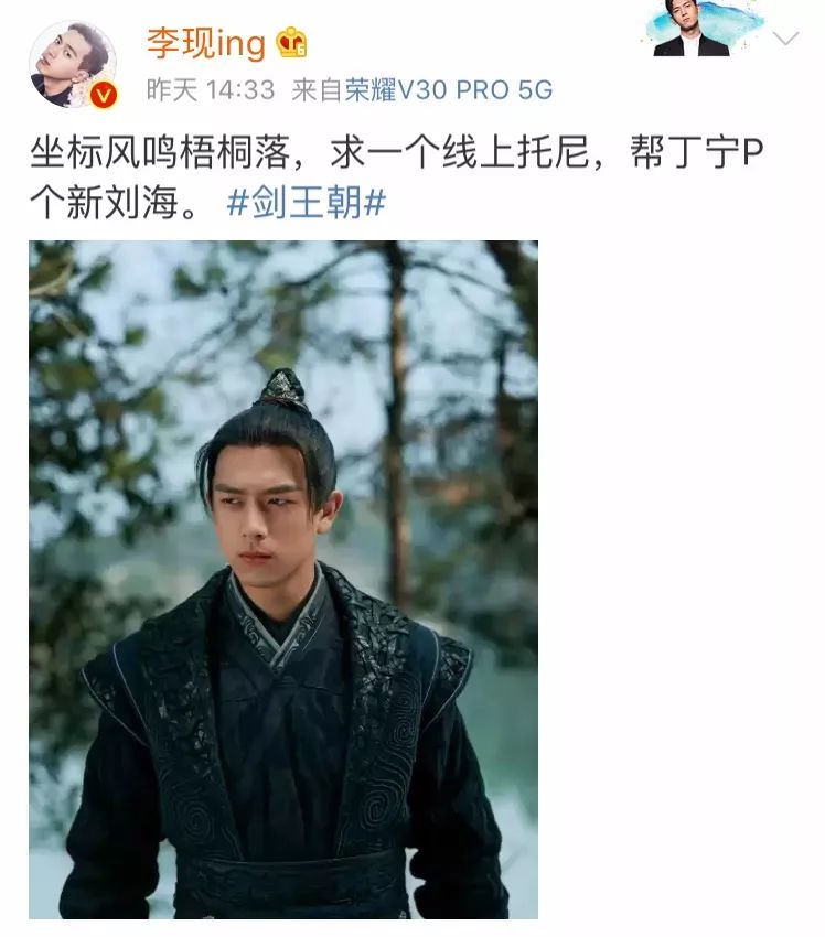 关于发型这件事李现也是超可爱的,自己发微博称:“坐标风鸣梧桐落,求一个线上托尼,帮丁宁P个新刘海”。哈哈哈,李现这波操作也是绝了。