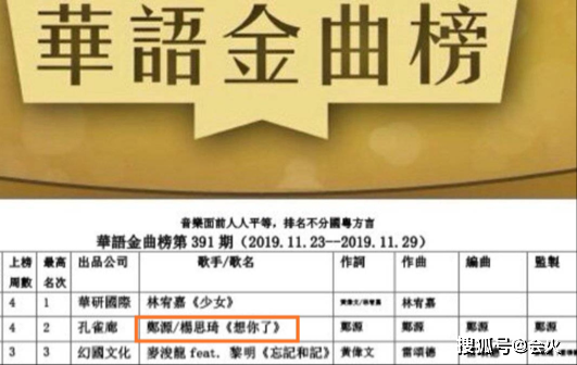 11月末,郑源作曲并与人合唱的歌曲《想你了》荣获华语金曲榜第391期亚军。