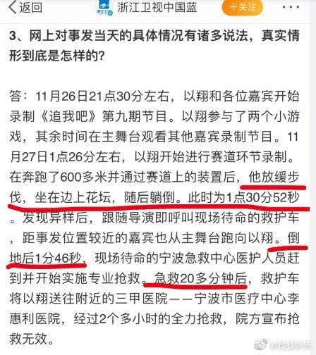 前几天,浙江卫视首度以采访的形式公开了事情经发,指“高以翔在凌晨1点30分52秒躺倒,倒地后1分46秒,现场待命的宁波急救中心医护人员赶到,并开始实施专抢救。”
