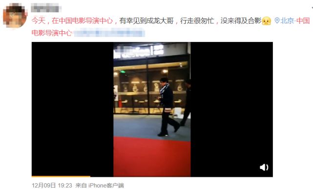 12月9日有网友在社交平台上晒出了一段偶遇成龙的视频,称在中国电影导演中心碰到了成龙,因为成龙走的非常匆忙,自己没有来得及合影语气中充满了遗憾。视频中成龙脖子上围着一条围巾,还背着一个女款包包引起了网友们的调侃。