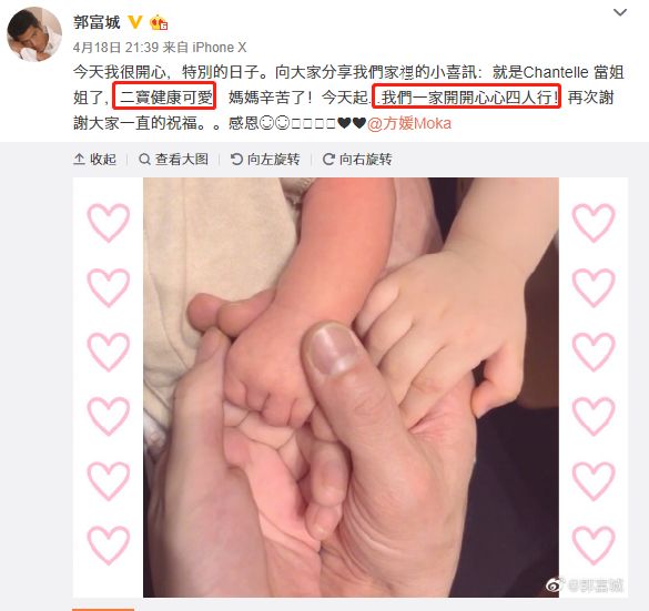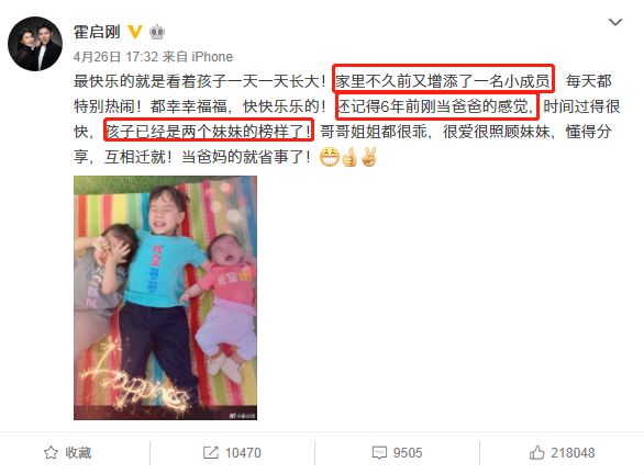 但同样是“名门贵族”的霍启刚郭晶晶家却是娱乐圈的一股清流,今年四月份霍启刚公布郭晶晶生了三胎女儿,字里行间显示的是一个普通父亲的喜悦心情。
