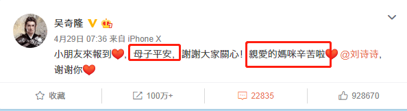 除了上面几位比较突出的,2019年也有两位女神生了小宝宝,一家三口岁月静好的模样。4月份的时候,刘诗诗和吴奇隆的儿子出生,49岁的吴奇隆终于当爹,文案很简单,报平安和表示老婆辛苦了。