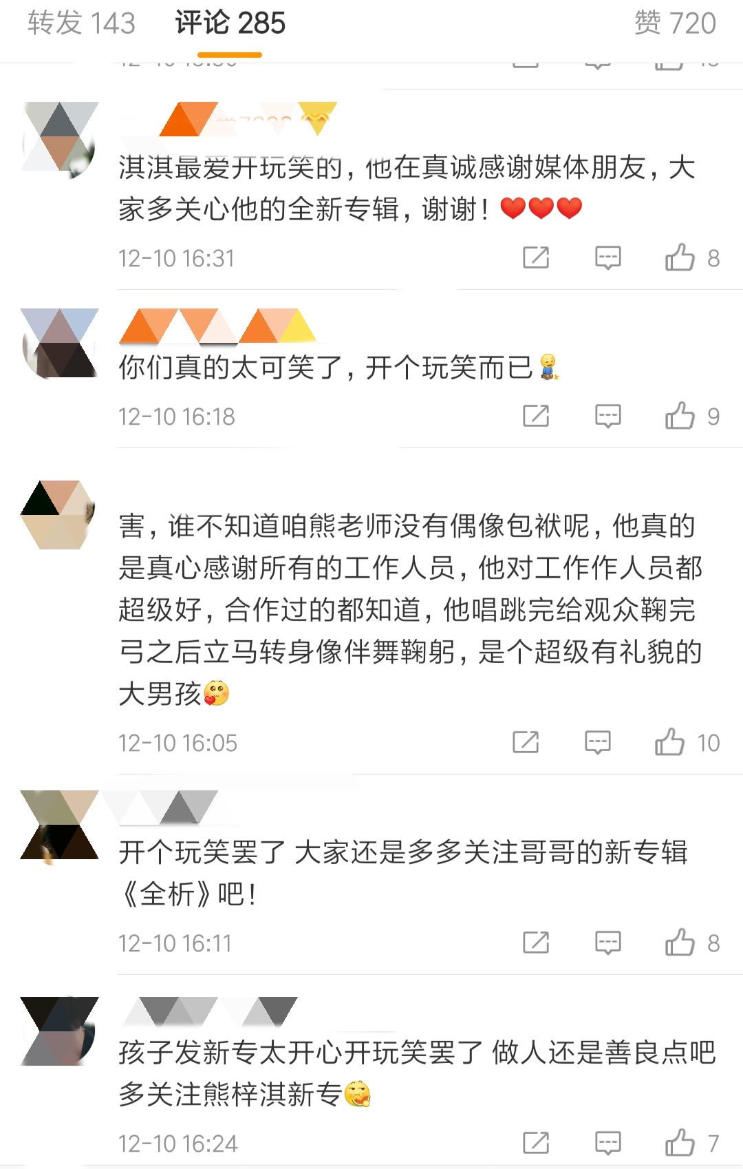 只有个别在场的网友为熊梓淇澄清,说他就是太激动了,一下子没把控好自己,不希望大家恶意解读这个行为。再者,熟悉他的人都知道,现实生活中小熊就是个逗比,喜欢跟人开玩笑,并没有想为此博眼球。