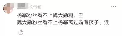 但甜的也只有路人,粉丝心里可全都是玻璃渣子,杨幂粉丝看不上魏大勋糊、丑,魏大勋粉丝看不上杨幂离婚有孩子、浪,互相觉得对家配不上自己爱豆。