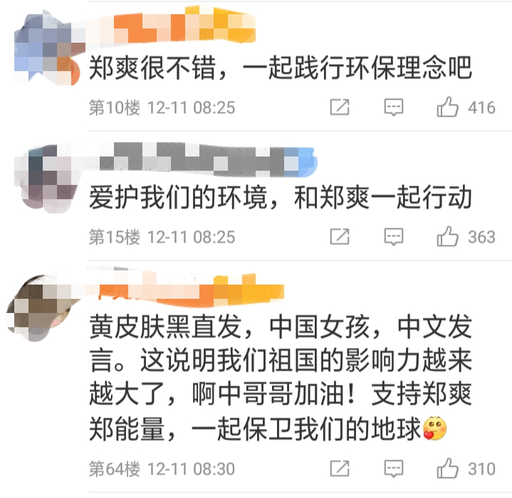 面对郑爽的呼吁,网友纷纷表示,一起践行环保理念;爱护环境,和郑爽一起行动;支持郑爽等等。