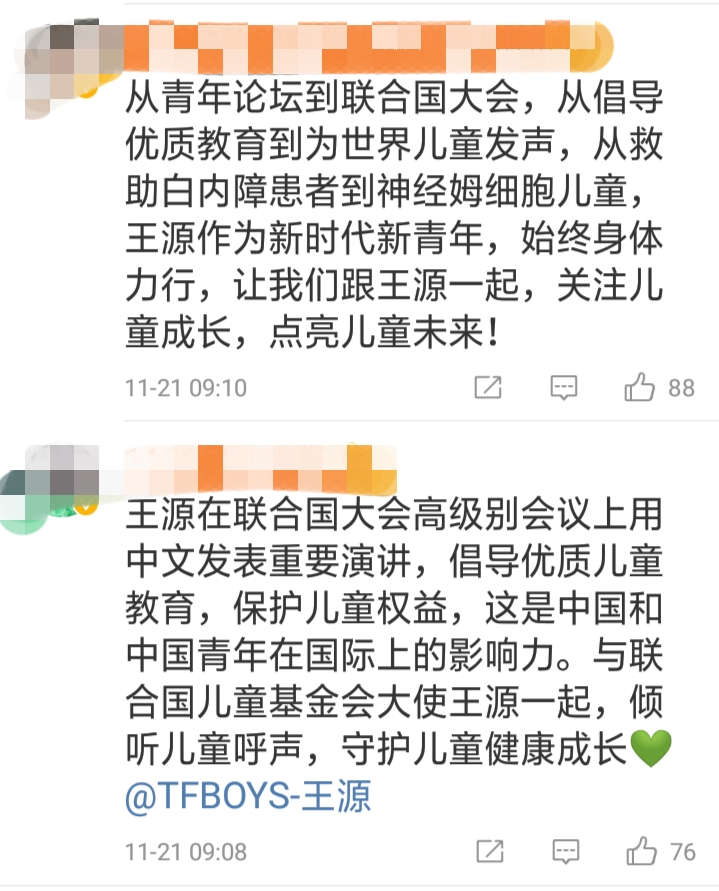 除了郑爽,王源也曾在联合国高级别会议现场进行全中文演讲。王源受邀参加联合国大会高级别会议,就儿童受教育的权利进行全中文演讲;会后,王源前往帝国大厦的点灯仪式,还受邀登顶在102层景观台参观。