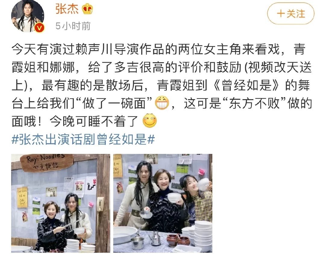 张杰在第二天早上也发布了微博表达了对林青霞和谢娜来观看话剧的感谢之情,分享了自己和林青霞、谢娜的合照。