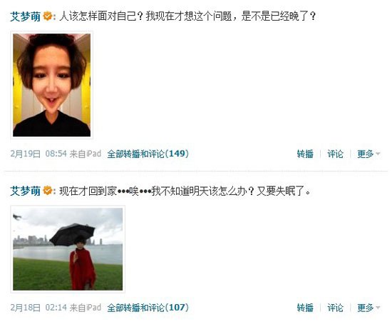 不过,艾梦萌的运势却并没有因此而一步登天,在此之后,艾梦萌陷入事业停滞的时段,特别是在2012年2月15日这天,艾梦萌突然在微博上发文“下了飞机,这是最后一次和你见面,我们分手了,六年的陪伴,划上了句号……但愿你和你的孩子一切都好!”引起了大家关注。