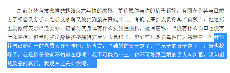 并且,在之后艾梦萌接受采访时,针对其与已婚有子的老男人分手传闻,她也直言:“结婚的日子定了,生孩子的日子定了,月嫂也找好了,就是孩子他爸不知道在哪呢!我不可能当小三,也不可能跟已婚的男人有纠葛,说句诅咒发誓的真话,我现在还是处女呢。”