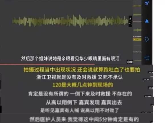 同时录制现场观众的录音也曝光了!再一次证实事发节目组是在等到嘉宾发现高以翔不对劲翻白眼才开始急救。目击者更表示医护人员赶来时,这中间肯定有五分钟,肯定没有所谓一倒下就及时救援的说法存在,浙江卫视再一次被打脸!