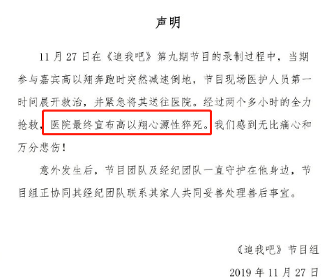 郭彦甫的症状,不禁让小扒想起了高以翔,一个活生生的大男孩突然逝世,他生前也是没有任何病痛,就是有点小感冒。熬夜消耗体力加上高强度运动猝死后,这是节目闯关环节不合理的地方,节目组却给不出当场的拍摄视频,只给出“高以翔心源性猝死”的答案。