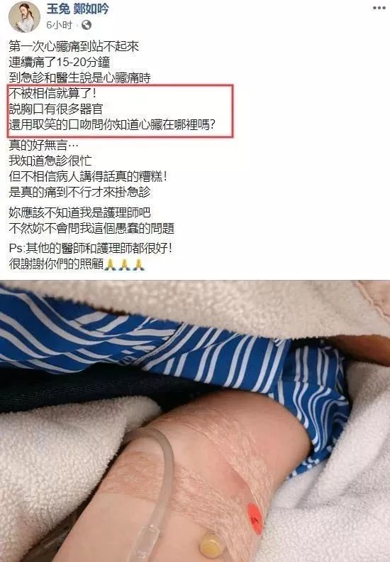 郑如吟期间和急诊医生有过一个小插曲,因为她表示心脏很疼痛,但是却被医生反问道“胸口有很多器官,你知道心脏在哪里吗?”因此,郑如吟觉到自己的生命被轻视,而感到无语。但她是幸运的,在感到疼痛顺利就医,在专业的治疗下身体得到好转。