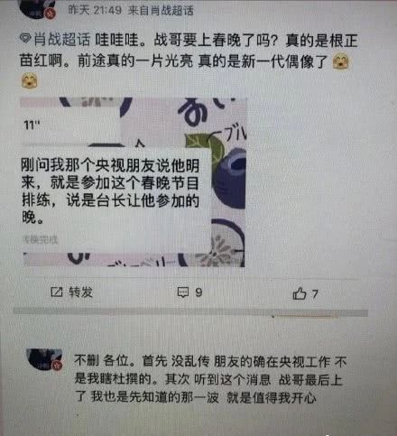 近日,又有网友爆料了一个关于肖战的一个好消息,称肖战已经参加了春晚的排练,很有可能出现在今年春晚的舞台上,同时该网友还爆料称是台长邀请肖战参加的春晚。在面对网友的质疑时,这个爆料者依然语气坚定,似乎对这件事有十足的把握。