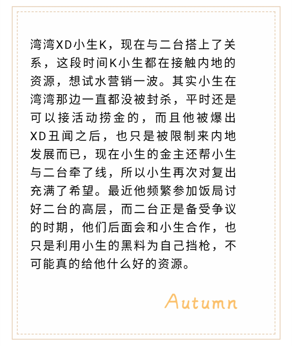 无独有偶,在12月11日夜晚,就有一位娱记在网络上爆料,他以字母不点名的方式,透露了柯震东这段时间其实一直都在接触内地的资源,其中,他的金主就帮其联系到了内地的二台高层,双方最近不仅频繁有饭局诞生,并且,在二台备受争议的时期,他们也有意与柯震东合作,并打算用其挡枪。