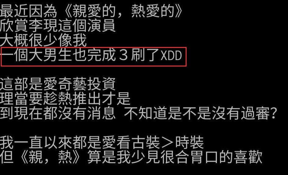 今年暑期播出的《亲爱的热爱的》不仅让李现火速跻身流量之列,在台湾也吸粉无数,大家都很期待“七月现男友”的新剧。有位台湾男粉表示,在等待李现新剧开播的这段时间,他都已经连刷三遍《亲爱的》。小扒都不得不感叹,李现的魅力连男粉都难以抵挡。