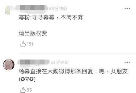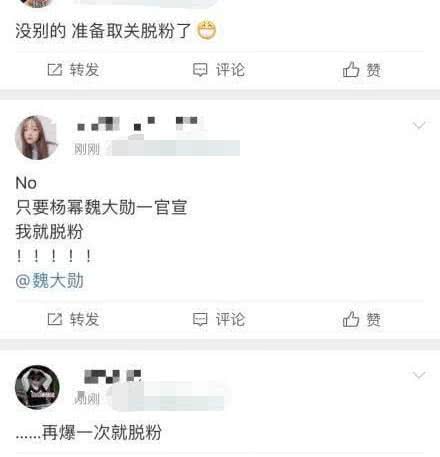 视频公布后,两人的粉丝在网络上撕得不可开交,纷纷认为对方倒贴配不上彼此。粉丝对于两人恋情的不认可,也出现了脱粉热潮,魏大勋粉丝更是直言魏大勋眼神不行。而杨幂粉丝的想法也是如出一辙,认为杨幂不务正业,对她的眼光也表示质疑,甚至有粉丝还脱粉回踩,细数着杨幂这些年的不长进和错误。